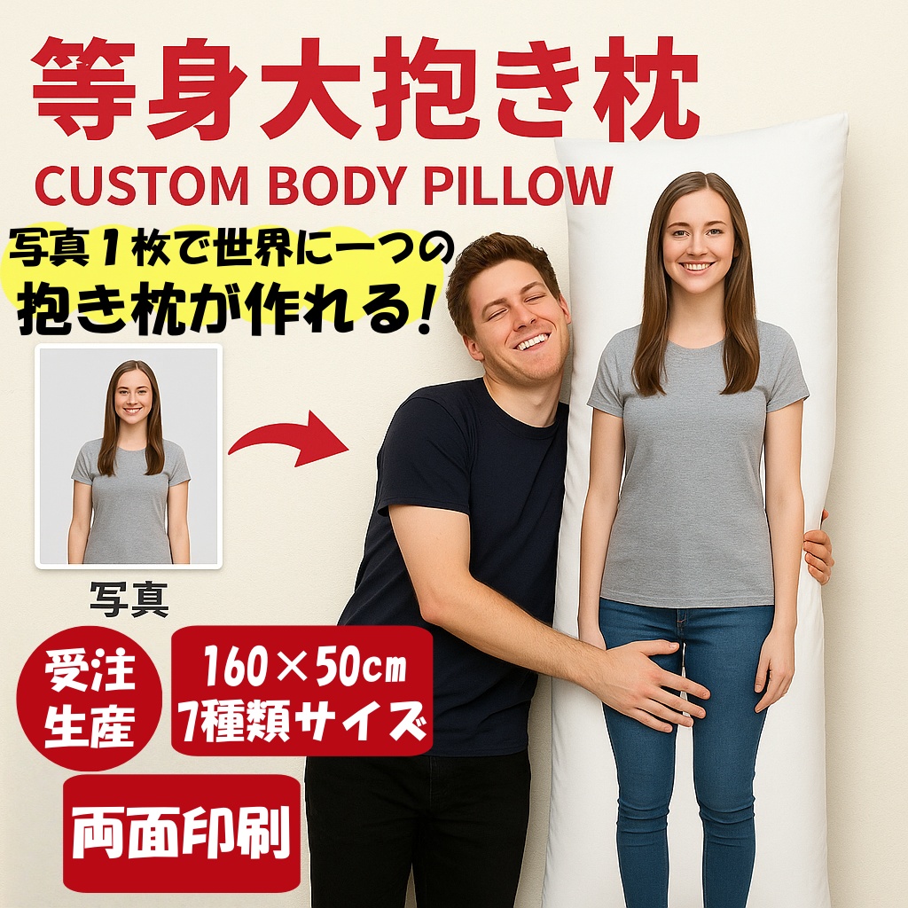 お子様や家族の思い出の写真、ペットの写真、イラストなどを だきまくら にプリントして、プレゼントやギフトに最適なオーダーメイド だきまくらカバーを製作いたします。誕生日プレゼントはもちろん 結婚祝い イベント 卒業 記念品 ノベルティ ロゴを入れて販促品としてもオススメな ロングクッション!自分で世界に一つだけの素敵なオリジナルプリントのボディーピローをお手頃価格でオーダーメイドできちゃいます!個人でも注文可能な小ロット1点から販売!
